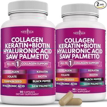 NEW AGE Collagen Capsules combine high-quality, grass-fed collagen with Biotin, Keratin, Saw Palmetto, Hyaluronic Acid, Vitamin E, MSM, Pumpkin Seed, and Folic Acid to support stronger hair, smoother skin, and healthier nails. This advanced beauty formula is perfect for those wanting to enhance their natural radiance from the inside out. Each bottle contains 90 capsules, and this pack offers double the value with two bottles. Designed for both women and men, it helps fight signs of aging, dryness, and weak hair or nails. The ingredients are carefully selected to nourish you at the cellular level while being convenient to take daily. As advised by the FDA, always consult your doctor before starting any supplement. Stop use immediately and seek medical attention if severe side effects occur.