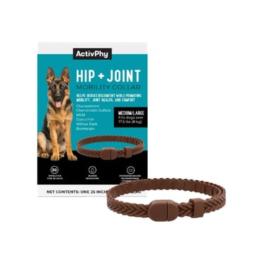 Revolutionize your dog's joint care with the ActivPhy Hip + Joint Mobility Collar, a groundbreaking supplement that delivers continuous, hassle-free support. Utilizing patented Micro Transdermal Technology, this convenient collar slowly releases a powerful blend of active ingredients—including Glucosamine, Chondroitin Sulfate, MSM, Curcumin, Willow Bark, and Bromelain—directly through your dog's skin for 24/7 absorption. This innovative approach ensures your dog never misses a dose, providing consistent support for joint comfort, cartilage health, and muscle function while helping to ease stiffness and discomfort associated with aging or activity. Water-resistant and effective for up to 30 days of continuous indoor/outdoor wear, it’s a perfect, low-maintenance solution for busy pet parents. Available in two adjustable sizes, this collar offers a modern alternative to daily chews or pills, making it easier than ever to support your dog's mobility, vitality, and overall quality of life.