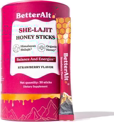 Nourish your body with a woman-centric Ayurvedic tradition through BetterAlt SHE-Lajit Strawberry Honeysticks. This unique formula is expertly crafted for women, combining the powerful adaptogen benefits of Pure Himalayan Shilajit with the hormone-balancing properties of Shatavari and the uplifting support of Saffron. Together, these ancient herbs work synergistically to help promote hormonal equilibrium, combat fatigue, enhance vitality, and support overall female wellness. Each convenient, mess-free stick delivers a daily dose in a delicious blend of natural honey and a hint of strawberry, thoughtfully designed to fit seamlessly into your on-the-go lifestyle—simply tear and enjoy. Made with clean, lab-tested ingredients and free from added sugars, preservatives, or artificial flavors, it’s a pure and tasty way to invest in your energy and balance. Whether you’re navigating a busy schedule, seeking natural hormonal support, or simply prioritizing your well-being, these honeysticks offer a delicious and effective path to feeling your best every day.